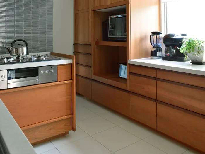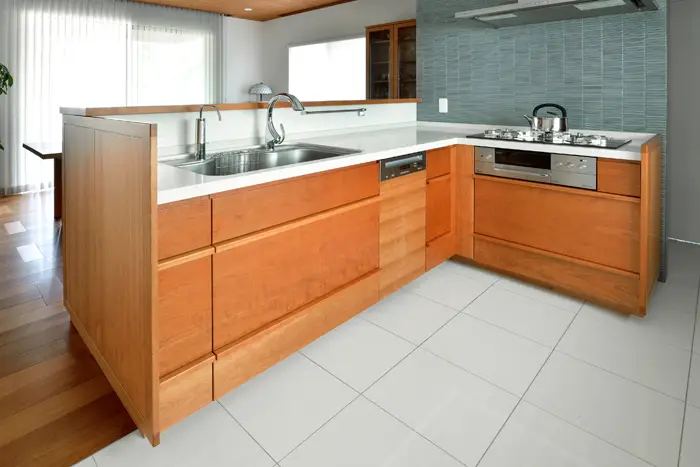 一方、オーダータイプではキッチン本体のサイズはもちろん、L型や二列型といった構成の根本的な部分から使用する機器やその配置、素材のセレクトまで全てを自由にデザインすることができます。