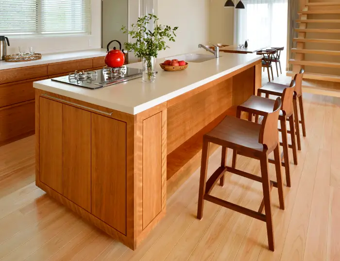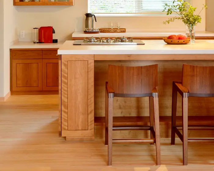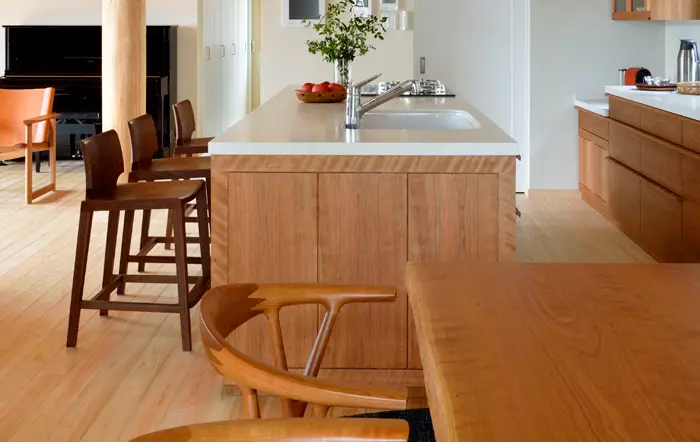キッチンというスペースではありますが、そこにあるのは無垢のチェリー材でつくられた家具のようなキャビネットであることからも、カウンターチェアに座った人とキッチンに立って調理する人の両方がリラックスできる空間です。