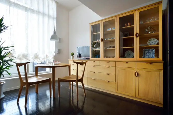 ハードメープル材で作られる家具は、テレビボード、キャビネット、ダイニングテーブル、ダイニングチェアなど様々です。