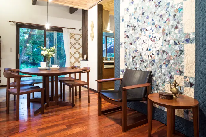 梁や柱もウォールナット材の無垢材家具と相まって、空間の一部として見事に溶け込んでいます。