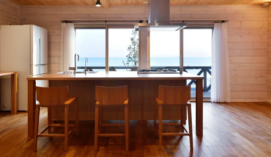 寛げる自宅でありながら海辺のリゾートホテルのように大自然を味わえる、日常と非日常が入り混じった魅力的な無垢材キッチンスペースです。