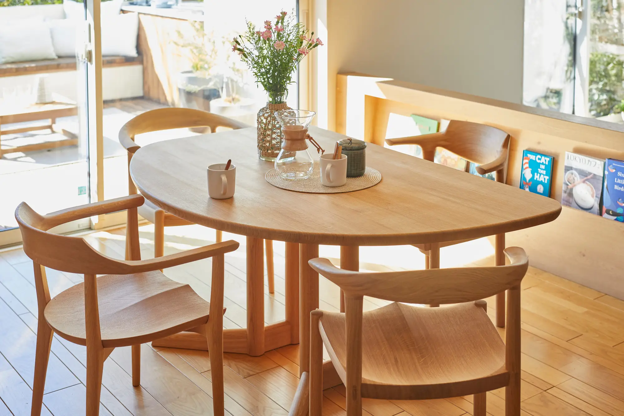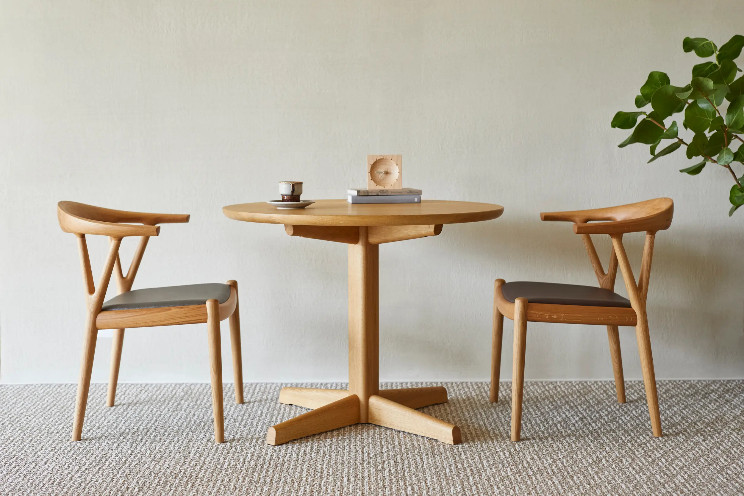 円形テーブルは空間全体に柔らかな印象を与え、軽やかな雰囲気を作り出します。
