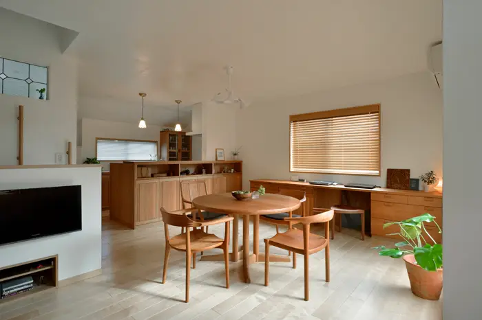 収納家具は奥行寸法を統一し、他の家具も含め高さを抑える