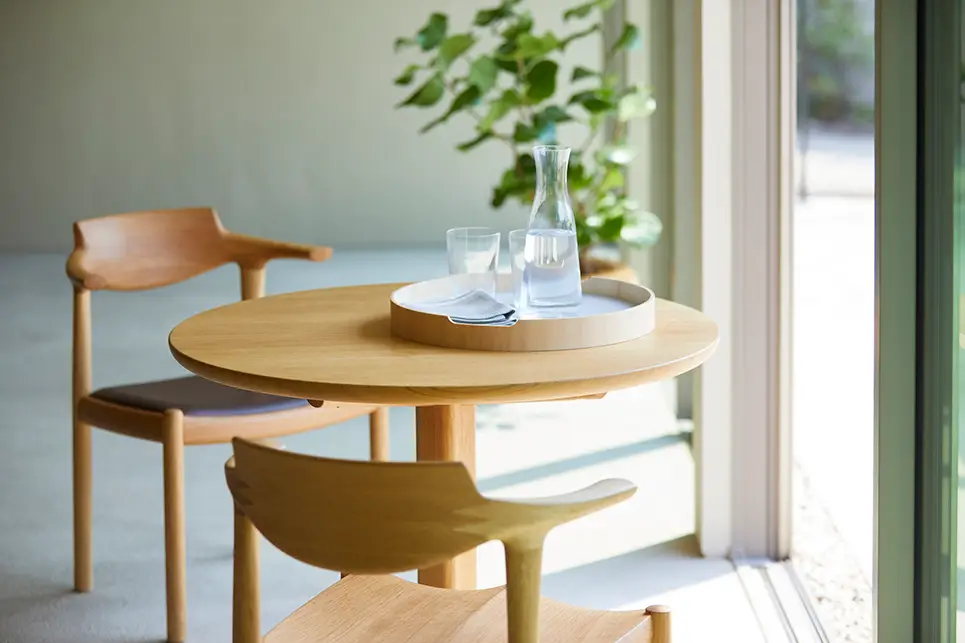 無垢材のテーブルは、手ざわりや木目の表情によって、日々の食卓を温かく彩ります。