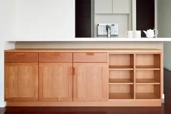 たいてい収納家具というものは奥行き40cmから45cmのものが多く、カウンター下に置くと出っ張りすぎてしまいます。