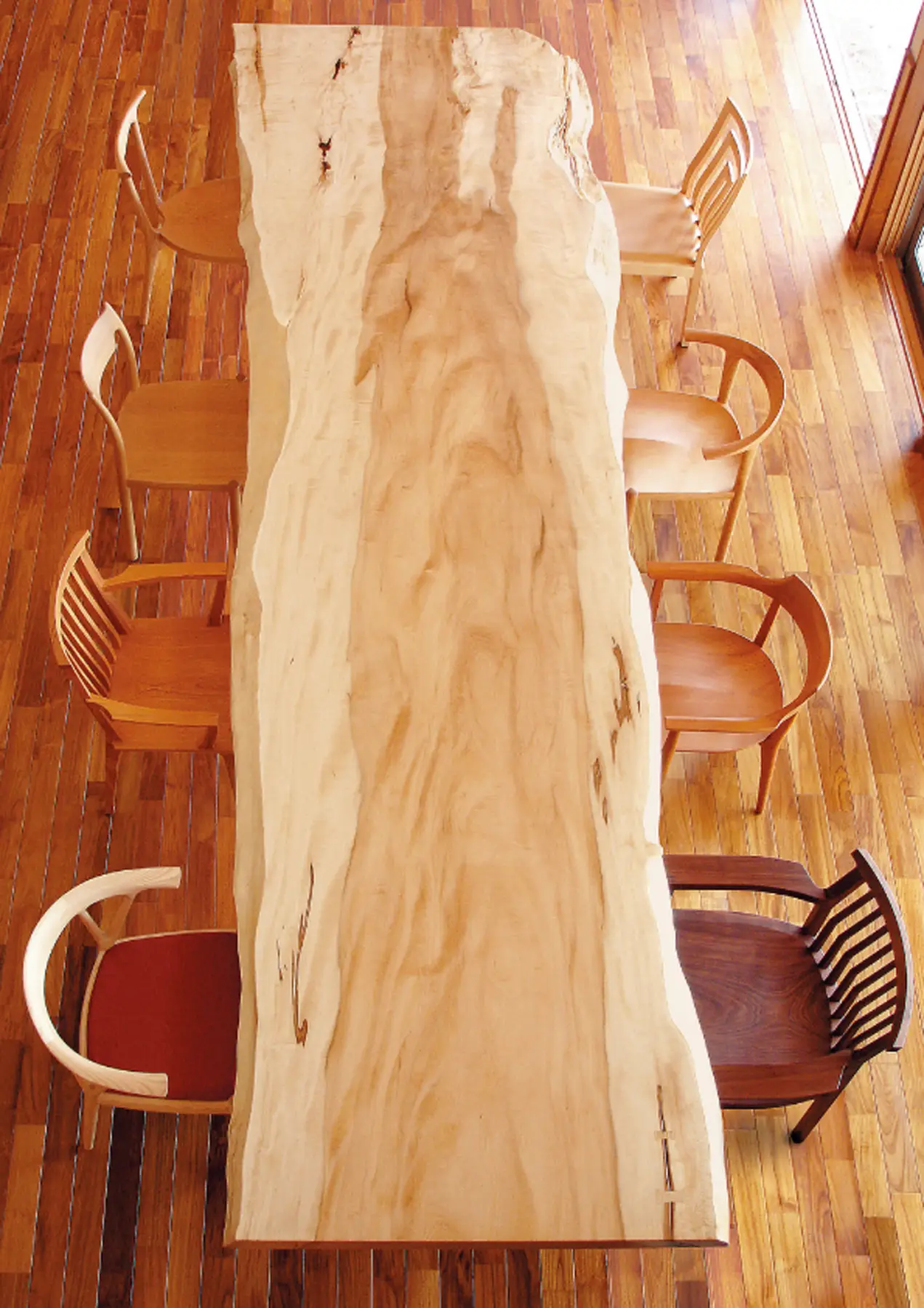 それを平面の板として挽くため、板面には複雑な木目が現れます。