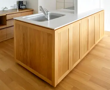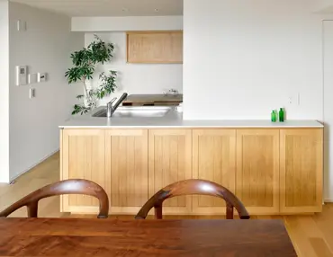 キッチン前面の収納扉や側面に施された羽目板のパネルは、縦方向に立体的なメリハリを演出しながら、どことなく「和」な雰囲気を持ち合わせています。