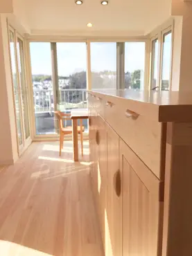 ご夫妻のお好みと全体のバランスを考慮しながら決定したのは、空間全体は明るく爽やかなメープル材を配置し、清潔感を演出し、ゆったりと寛ぐことを目的とするリビング部にはウォールナットを入れ、大人の雰囲気をつくりあげる空間。