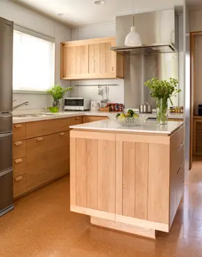 耐水性、対汚性に強く安価なのと、モノを落下させても音が下に響きにくいため、賃貸マンションなどでも良く見かけます。