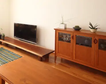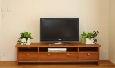 家電のように無機質な物の両側に観葉植物を配置すると、殺風景になりがちな空間が優しい雰囲気となります。TVボードはTVよりもサイズが大きいことがセオリーではありますが、その際に見た目のバランスだけでなく、ディスプレイとしての美しさを表現できます。