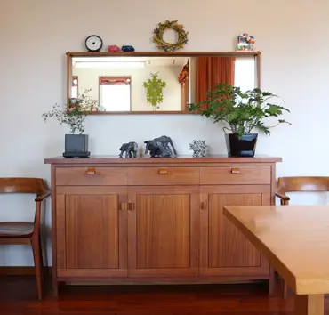 また、サイドボードの天板上に単純に雑貨や写真を飾るだけでなく、両脇を観葉植物で引き締め