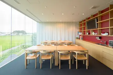 窓が無い空間でもこれだけ伸びやかな雰囲気になるのは緑の力。