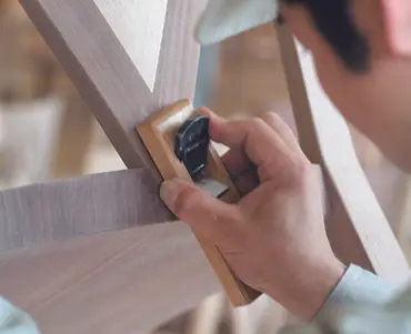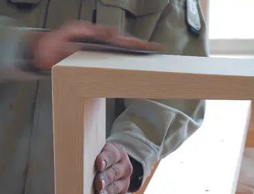 家具蔵の家具は「手仕上げ」がモットーです。特に繊細なこの部分は、例えばチェアであれば10種類程の道具を使用します。切り出しの段階で、接合部が一体になるように削りながら「面取り」をし、カンナをかけて表面を馴染ませながらパーツ同士を一体化させていきます。これを「さすり仕上げ」といい、触れても繋ぎ目を感じさせないほどの滑らかさを生み出します。