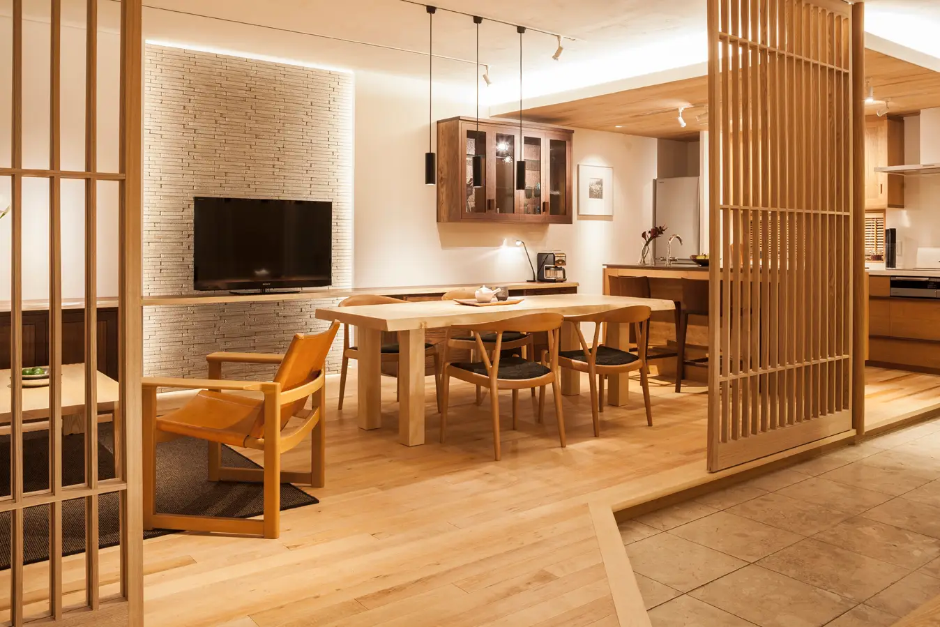 無垢材家具と自然素材が調和した住空間を再現しています。
