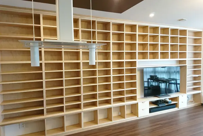 まる一日の取付け工程を経て美しく収まった壁面収納