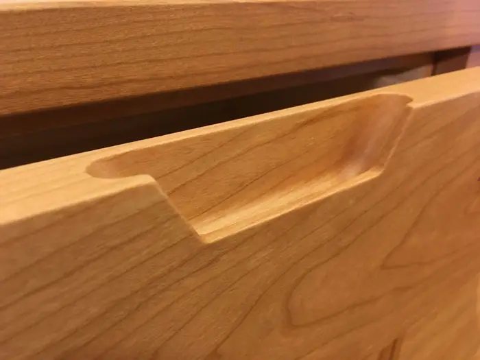 戸板に手掛けの掘り込みを入れ、取手が飛び出ないスタイルの引手加工です。