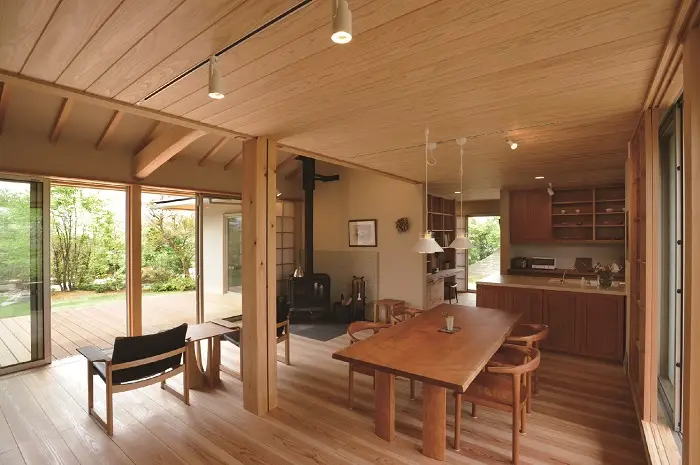 調理に使用する薪ストーブをキッチンとダイニングの近くに設置する際は暖房としても機能するよう、薪ストーブの上部を吹き抜けとすると良いでしょう。