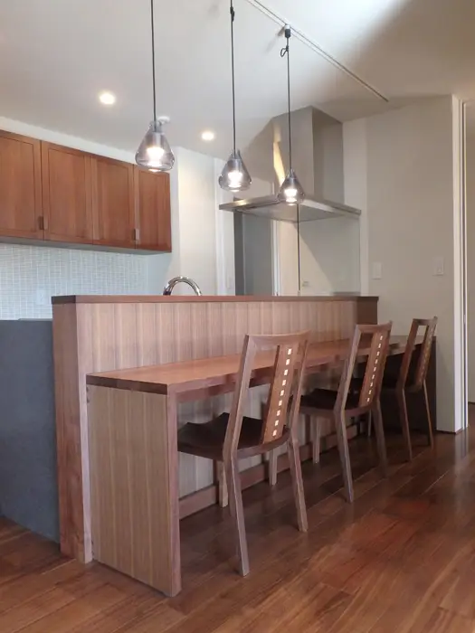 また、キッチンカウンターをダイニングテーブルと同じくらいの高さのカウンターにすることで、ダイニングチェアをそのままカウンターにも使うこともできます。