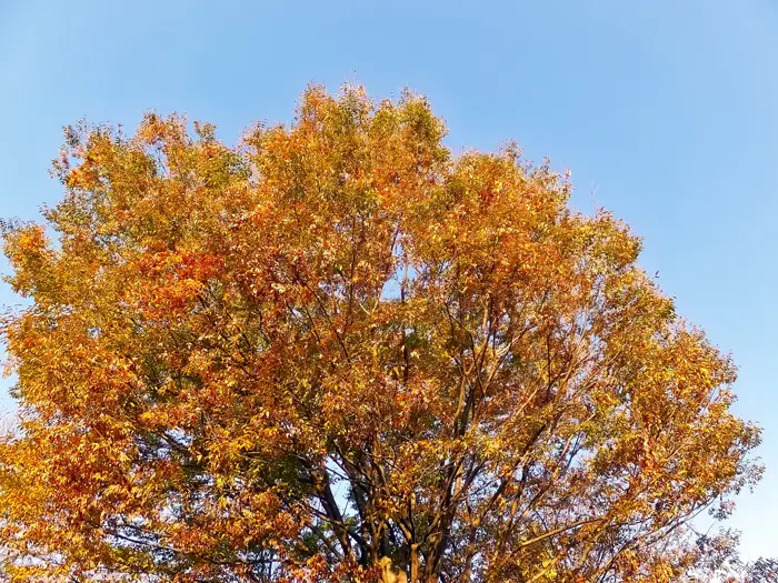 秋に見せる紅葉は、個体によって赤色に変化したり黄褐色に変化したりするので、夏から秋にかけてのケヤキ並木は様々な色調が同居し私たちの目を楽しませてくれます。