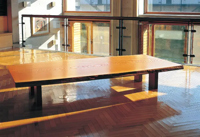 家具蔵のショールームにも熟練の職人によって魅力を引き出された、ケヤキ材の家具や天板を展示しています。