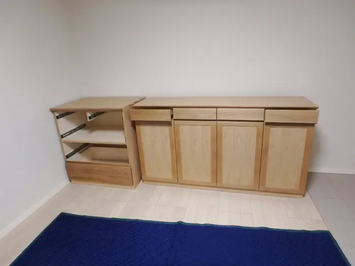 お仏壇を置く下台になる部分は、奥行が640mmと深いため、引出しを一度外して搬入し、一つ一つのユニットを並べて、床の不陸を確認しながらジョイントします。
