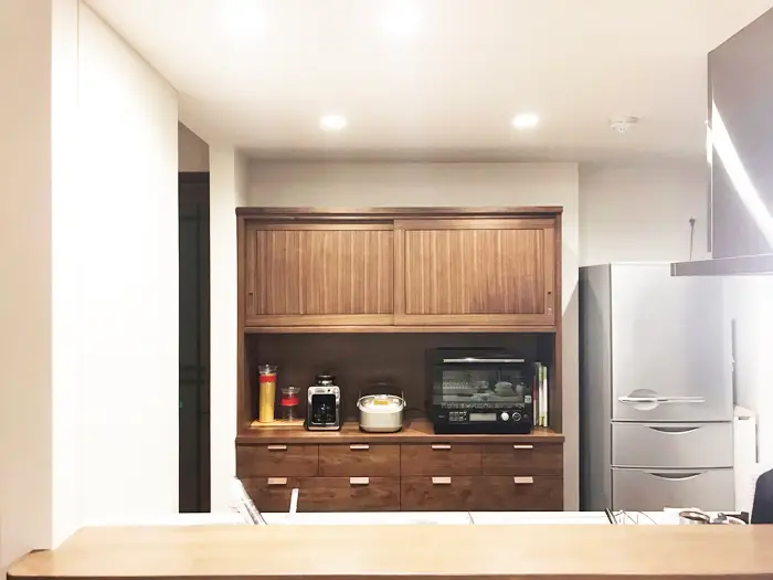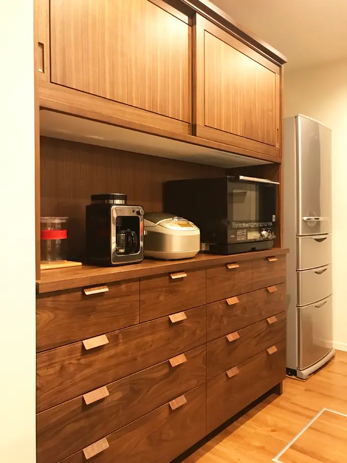 すでにダイニングテーブルは北海道産のナラ材で作った「テーブルビオス」をお使いでいらっしゃったため、それに負けない存在感を出すため、ウォールナット材の無垢材で作るキッチンボードをご選択いただきました。