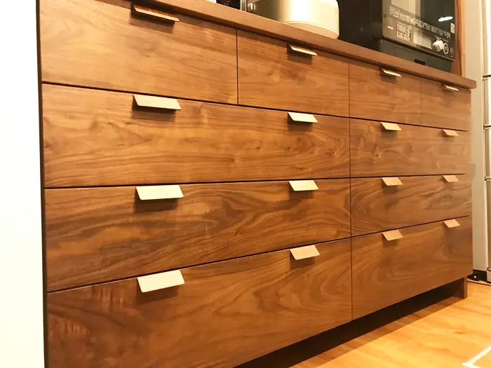 それぞれの引出は一枚の板から作り出すため、横に並ぶ引出も綺麗に木目が通ります。