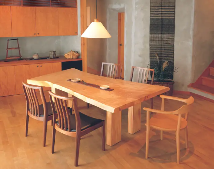 一枚板テーブルの色味や樹形、存在感により一枚板のテーブルは、お部屋の主役になるほどの存在感があります。