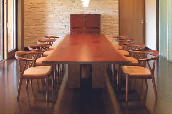 それが、見る人・使う人の心を打つ無垢材一枚板テーブルの美しさや、横一列に並んだ引出しの前板の木目が繋がる(木目通し)ことを生むのです。