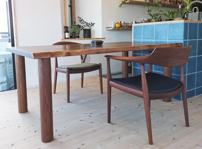 一枚板天板の持つ、自然な質感を損なうことなく、存分に味わうことができることも木製脚を選ぶ大きなメリットです。