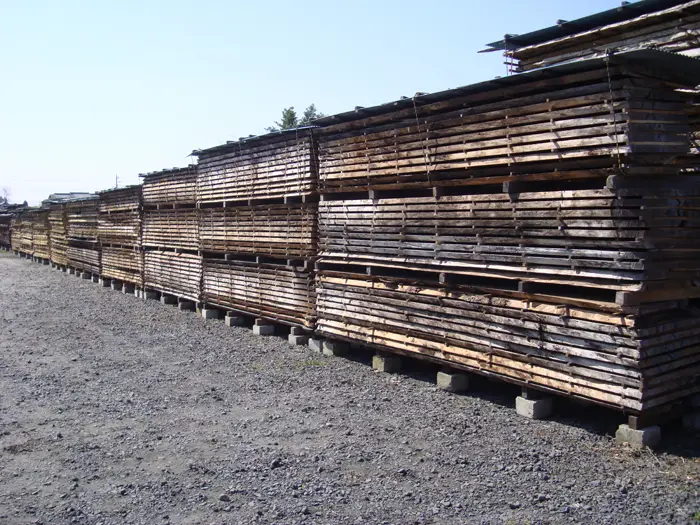 含水率が12~13%になるまでゆっくりと自然乾燥させるなかで、この期間は板と板との間に桟棒を入れ積み重ねて保管します。
